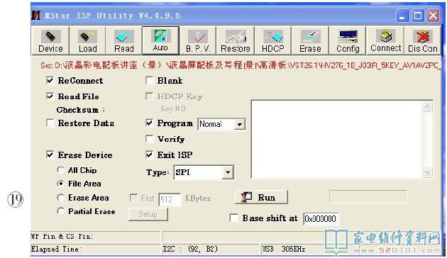 4.点击“Auto”切换到升级页面,如图19所示,去掉“Blank”、“Verify”两个复选项前面的勾(“Reconnect”项前面的勾也可去掉),然后点击“Run”开始升级,这时会出现蓝色升级进度条,如图20所示。