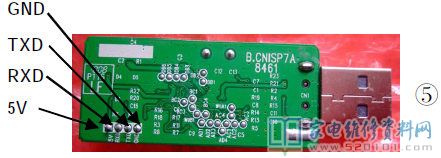 该高清板的升级工具如图4所示,升级的端口功能标注如图5所示。升级时,用四根导线将升级端口与高清板的蓝色插座相连,但引脚功能一定要对应,如图6所示。