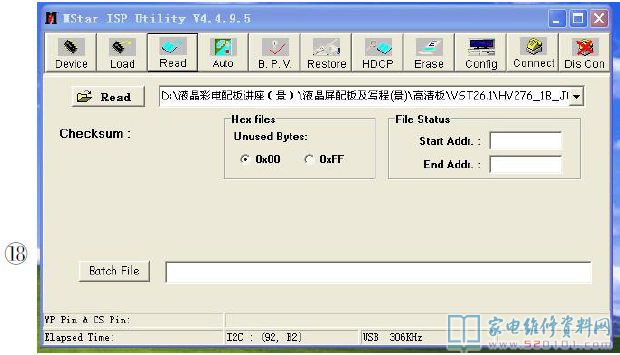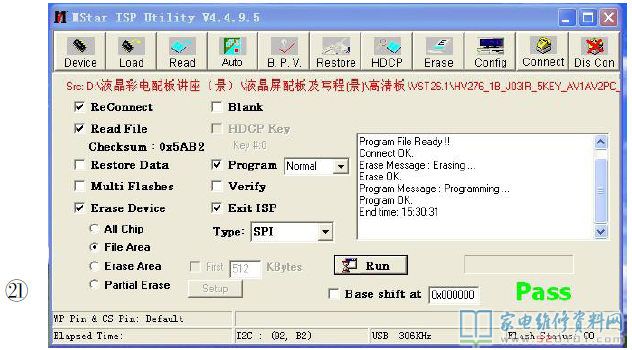 提示:液晶屏型号的识别、上屏线的选择及跳线、烧写程序的查找等操作,请参见《家电维修》杂志2010年第1耀5期中的《图解液晶彩电万能板的代换》系列文章,在此不再赘述。