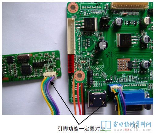 6.写好程序后断电,然后按照万能板的插座标注,接上+5VSB、+5V、+12V、+24V电压(伴音功放未采用数字功放的,不用接+24V)及遥控接收头,接下来插上对应的屏线,选择好正确的上屏电压,便可以试机了。