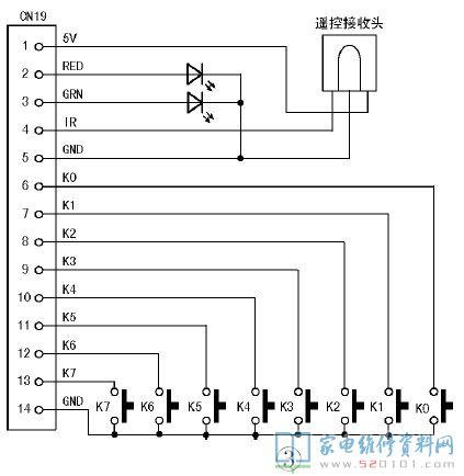 见下图1,该板插座的背面均有引脚功能标注,按照标注接线即可。值得一起的是,CN12插座中“PWON”为开关电源的开/待机控制端,高电平有效;CN3插座中“BLO”为背光灯驱动板(即高压板或逆变板)的开/关控制端,高电平有效;“ADJ”为背光灯亮度调节端。按键及遥控信号输入插座CN19中的按键及遥控接收头的接法如图3所示(见上页),按键的另一端全接地,改装非常方便。其中,K0或K6可用于开机。