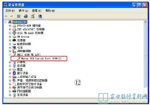 3.依次打开电脑的“控制面板”、“硬件”、“设备管理器”,如果有如图12所示红色方框内的设备,这说明升级工具驱动安装正确。提示院如安装失败,则拔下USB串口升级工具,然后重新插上,电脑会自动检测到新硬件,这时选择自动安装驱动即可。