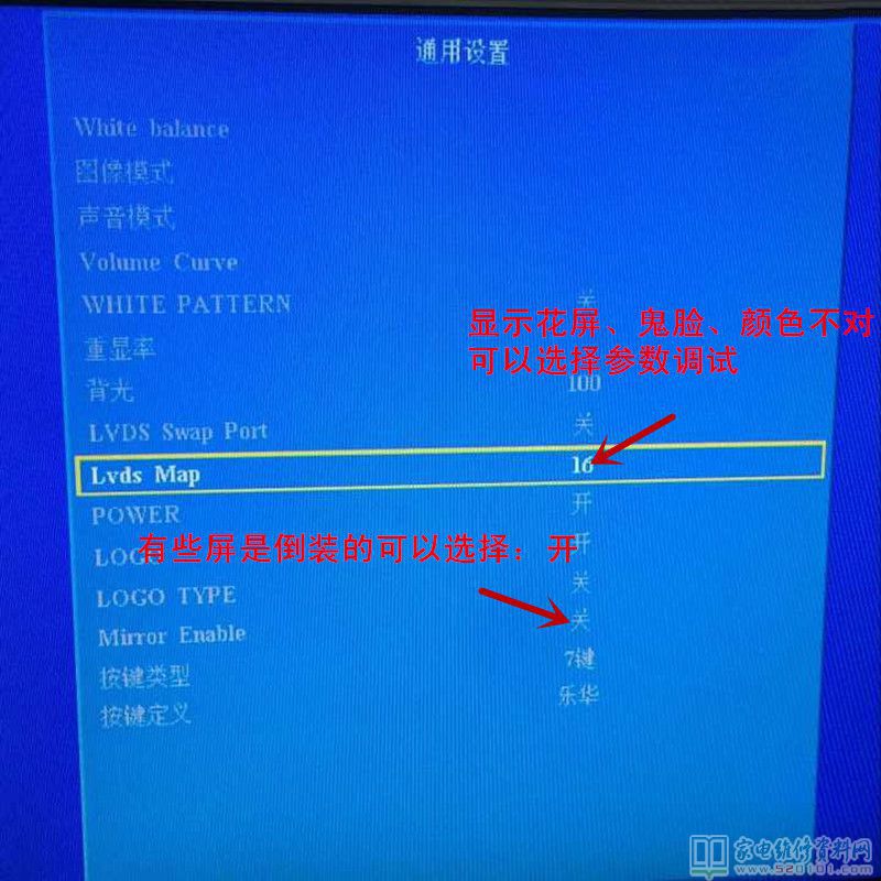 在进入“通用设置”这个菜单之后,选择“Lvds Map”的参数,通过调整此参数可以解决显示花屏、鬼脸、颜色不对等问题。有一些屏是倒装的,可以选择“Mirror Enable”的开关,来进行调整。