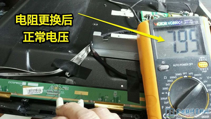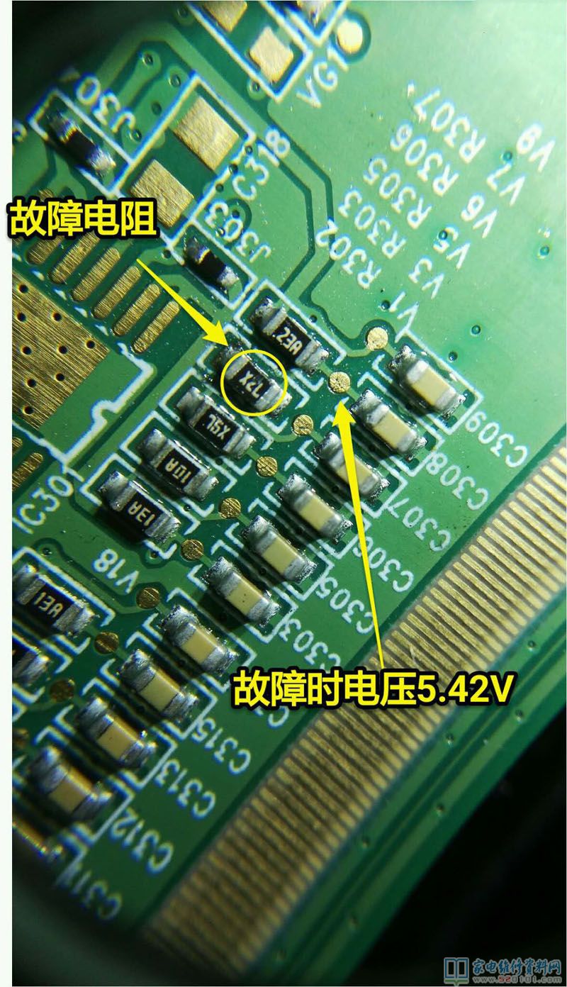 接修客户送来一台32寸杂牌液晶电视,故障表现为开机图像暗而且有色斑拖尾现象,拆开机器检查屏线接触良好,通用板点屏试机,故障依旧。说明不是主板原因,那故障重点就在逻辑板了,这种现象要么信号处理芯片不正常,要么伽玛电路不正常,以下是故障时的伽玛电压:V1 11.92V V3 10.88V V5 9.98V V6 8.89V V7 5.42V V9 4.33V 后面V7 V9电压明显不正常,因为是逐级分压,首先拆下检查R306 69X 测量阻值2K左右,因为这些电阻上面的标注与常见的不同,我也不清楚具体阻值是多少,就找了一块差不多的逻辑板,拆了一个标注71X 的电阻,测量一下差不多52欧姆,把这个电阻换上,测量V7电压上升为7.99,此时观看图像,已经清晰,故障排除,发此文分享给同行借鉴。
