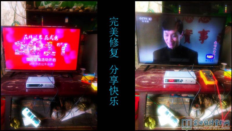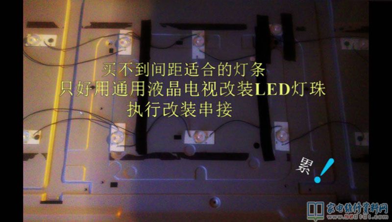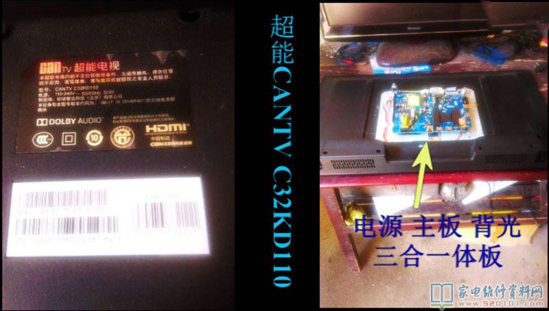 接修一台超能CANTV C32KD110液晶电视,故障表现为伴音正常,没有图像,开机声音正常,仔细观察发现有非常暗淡的图文(暗屏),认真检查液晶屏没有明显损伤。拆机后会看到此机为电源、主板、背光板三合一集成板,找到升压组件位置,经测开机瞬间背光源供电由63V逐渐下降到24V左右(保护)。如果液晶电视开机没有产生高压,只有12V或24V供电,多为板级电路故障问题,有高压多为屏级背光灯故障了,拆屏!32寸屏赤手拿下没问题。拆屏后检测到有两颗灯珠不能点亮,只好全换同类型灯珠,机器修复。