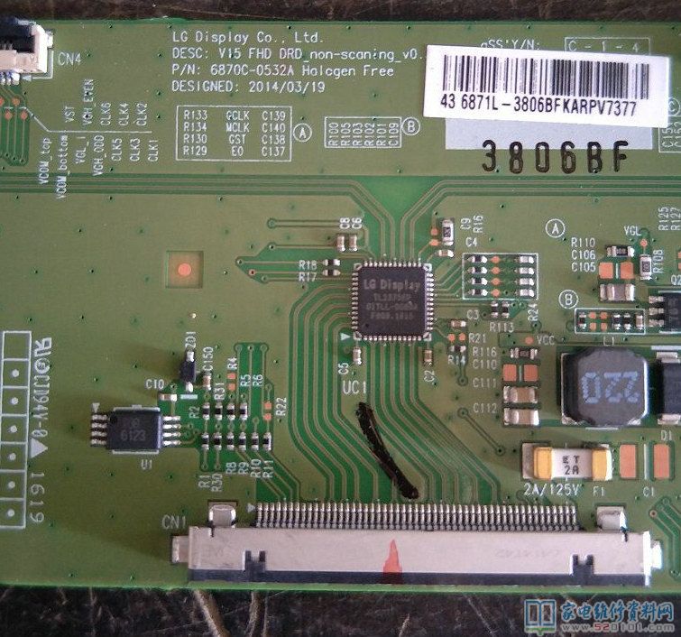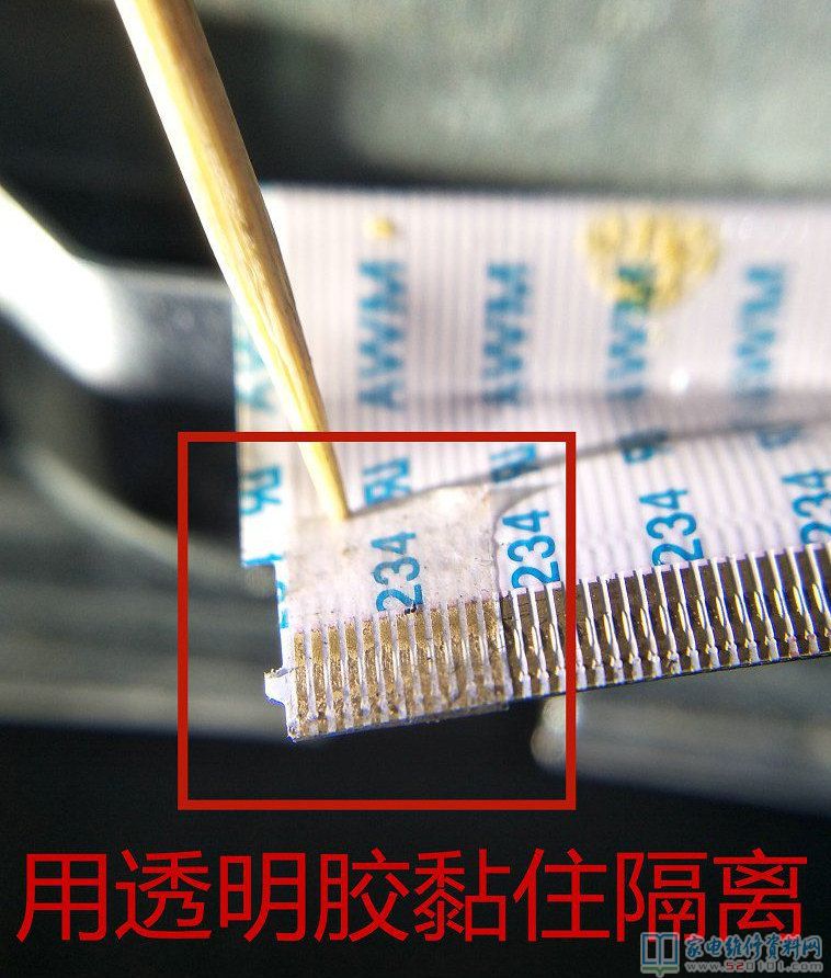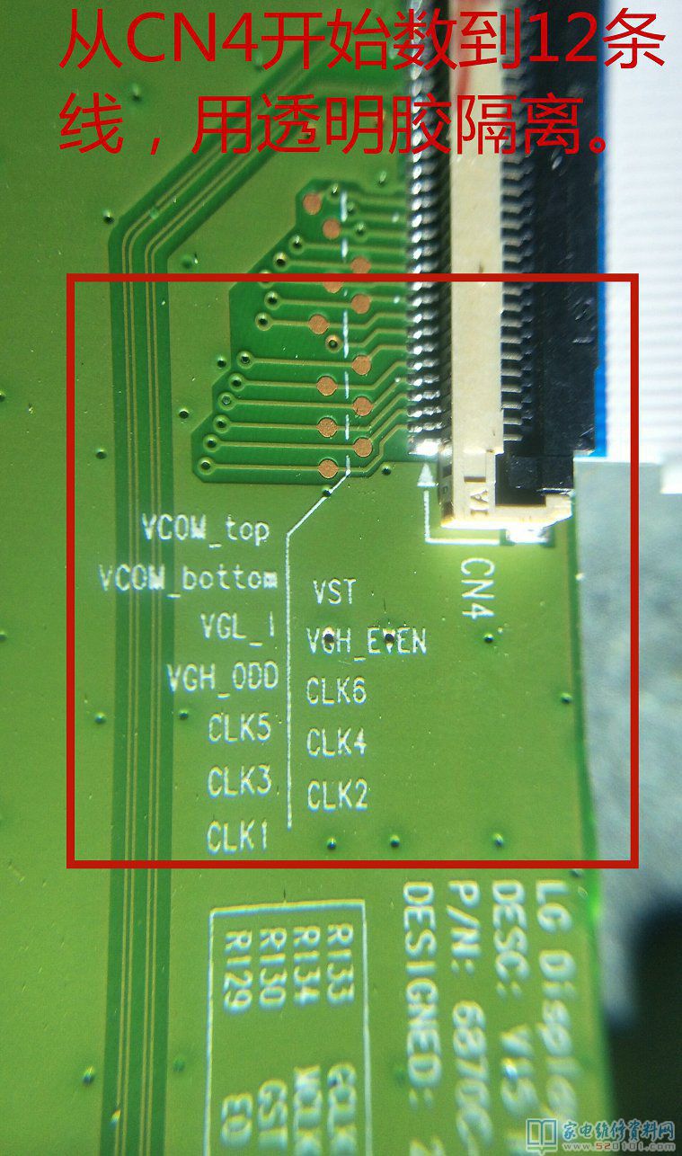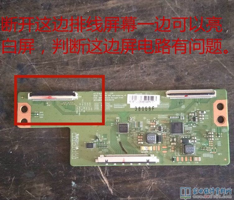 接修一台乐视超级电视L433L3,故障表现为开机有声无图,背光亮,屏亮暗蓝色,无图像。拆开机器,量逻辑板12V正常,其它电压不正常(此处省略废话)。查得是屏坏,屏电路有故障。接下来只能隔离开这一部分电路的讯号应急维修了,首先断开左边故障一样,断开右边排线屏幕有量一边白屏。故右边屏有问题,尝试三星屏处理是方法,经多次试验,断开从CN4开始数过去12条线,屏幕正常使用,用透明胶或者纸隔离出这12条线完美修复,至于这次维修后能用多久那得看运气了。