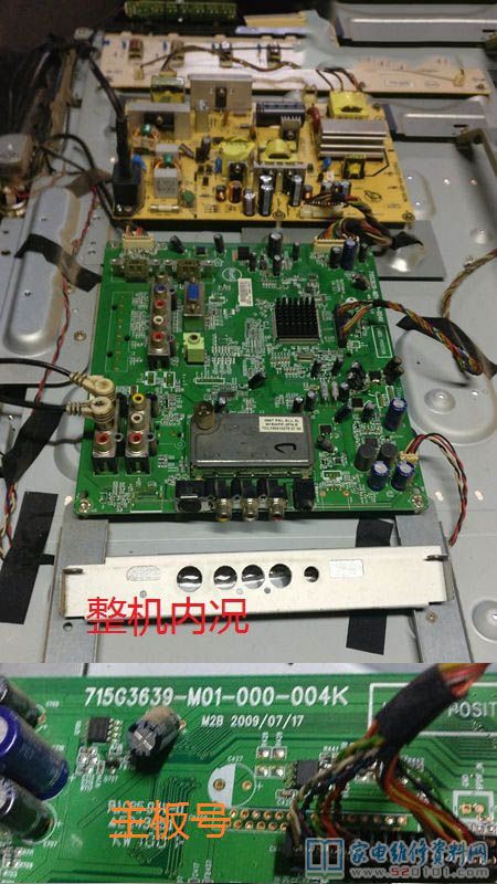 首先拆盖检测电源板上输出的5V、12V、24V电压都正常,目标就转移到主板上来了。开机等待故障出现时,当测主板上的其中一个稳压块(1.2V)的时候,表针会随着图声打隔时,此电压会一上一下地摆动,手摸此稳压管发热严重,再理电路,前面还有一个3.3V的稳压块,手摸上去更烫手,说明问题就在此处了。