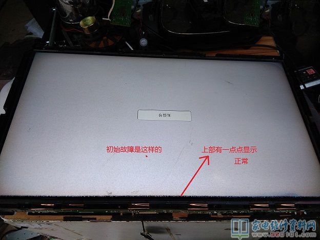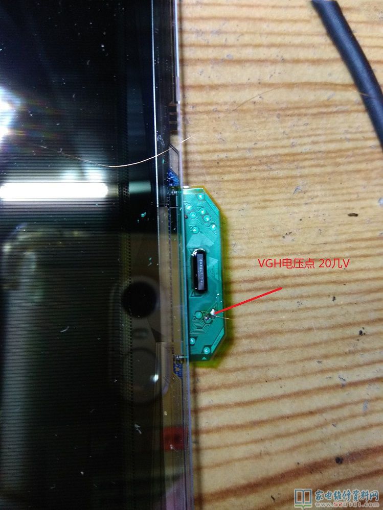 接修一台AOC冠捷32寸电视,故障表现为开机背光正常,白光看不见噪点,有无信号字样,图像失真严重。拆开机器,判断为VGH电压没有加载到右边的COF芯片上,经过实测,飞线方法如图,飞线后图像正常。