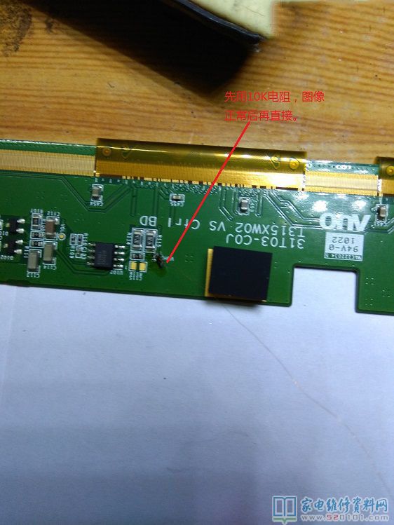 边板飞线点(因为没有资料,不确定哪一个点是VGH,防止飞错损坏。所以串10K电阻。一般来说,VGH经过10K压降后仍然可以驱动。这个电压点开路后一般是负压1-4V或者正压1-3V且不固定)