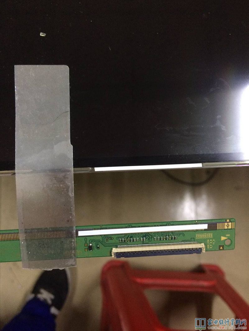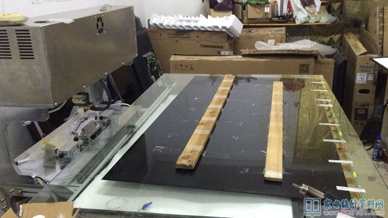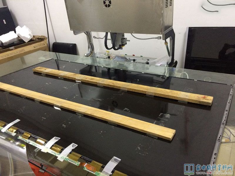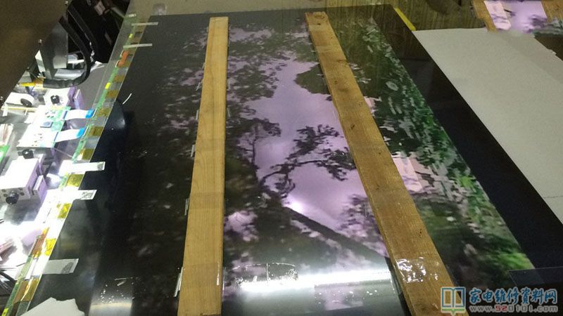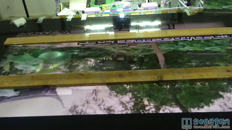 过了几天,快递小哥送到,可以拆屏了,难点来了,以前55寸一下都可以独自搞定,这个65寸从来没拆过,所以过程小心翼翼,我用了两根方条用于支撑屏幕,轻轻提,居然提不起来,原来屏幕和框架有胶粘着,这个时候如何用蛮力提,肯定屏幕报废,这时候用剪一小片报废反光膜,粘一下无水酒精沿着屏幕慢慢划开,然后两个人一起才把屏幕提出来,放上压屏台,拆胶,清洗,对位,压TAB,最后试机,故障排除。最后总结,拆和装,非常关键,压TAB,关键是清洗。