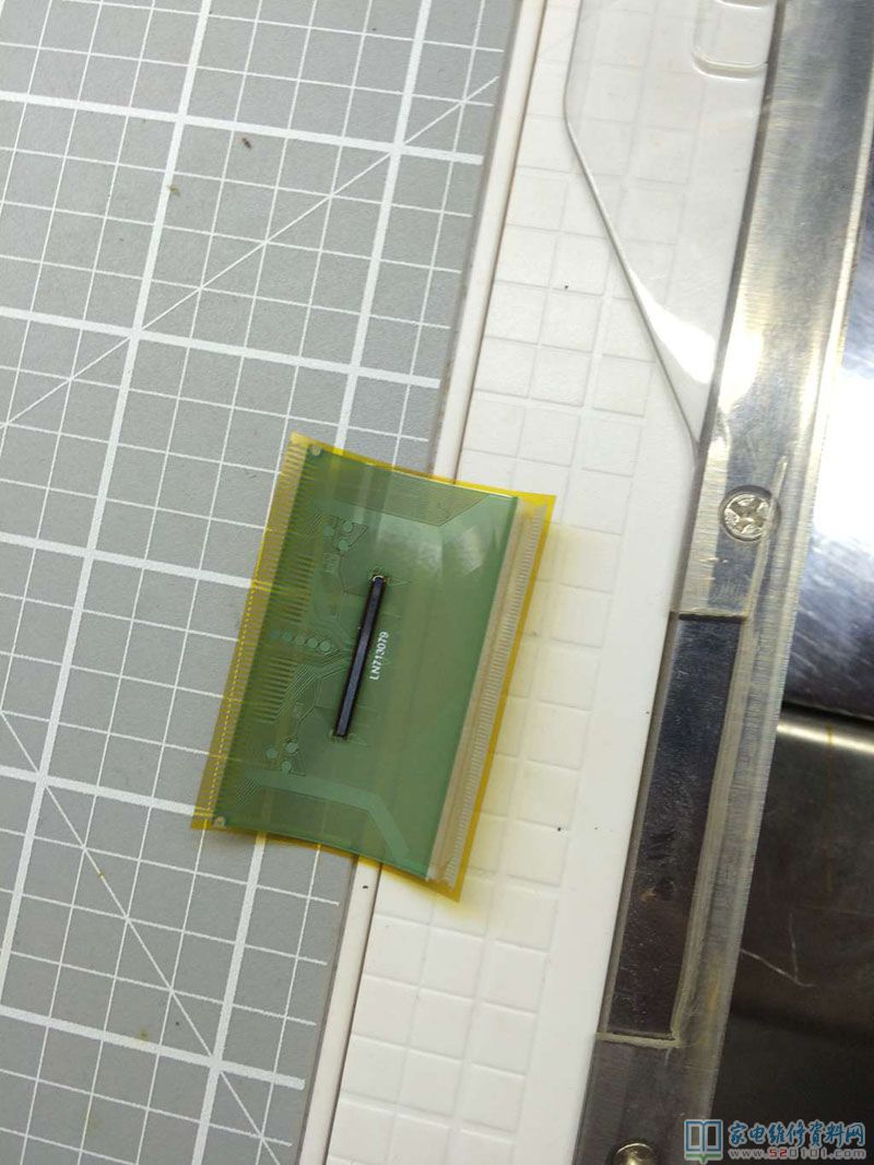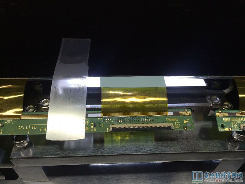 近期接修一台65寸液晶电视,故障表现是灰屏,客户反应没灰屏的时候中间是一条竖黑带,放了一阵子就什么没有了,开盖检查,逻辑板12V正常,其他关键VHG,VGH电压没有,用表测对地电阻才10多欧,明显短路了,断开屏排线,阻值恢复,明显就是TAB有短路,根据用户描述中间原来是黑带,故先吹下黑带对应的TAB,再接上逻辑板,好了不短路了,看来就是它坏了,此时再开机,图像出来了,就是中间有一条黑带,于是网购买了两全新的TAB。