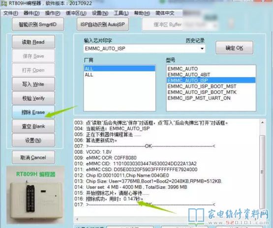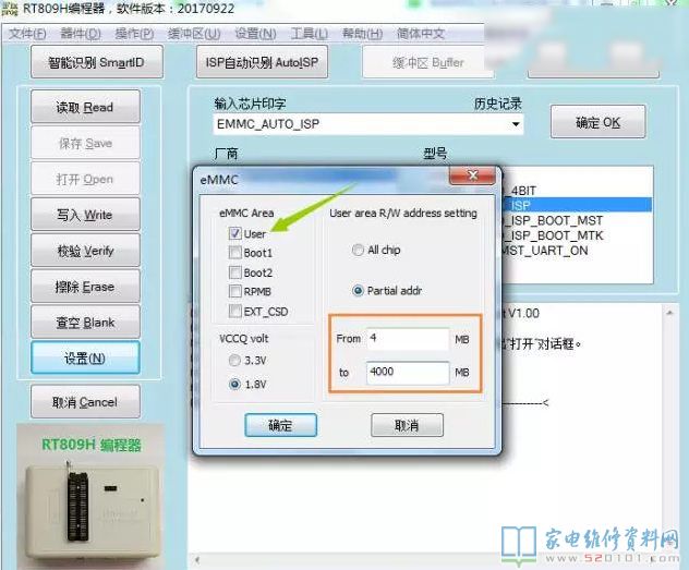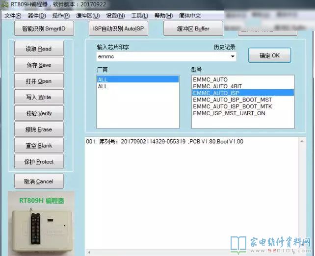 2、打开RT809H操作界面,在输入芯片印字框内输入EMMC,下方右侧小框会弹出跟EMMC相关的小类,选EMMC_AUTO_ISP;