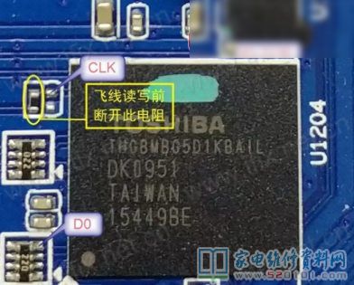 1、找到CMD、CLK、D0这三个点,用ISP彩线分别焊接好CMD(紫色)、CLK(白色)、D0(绿色)、地(黑色)这四个点,断开CLK通讯,然后插入RT809H编程器ISP口;