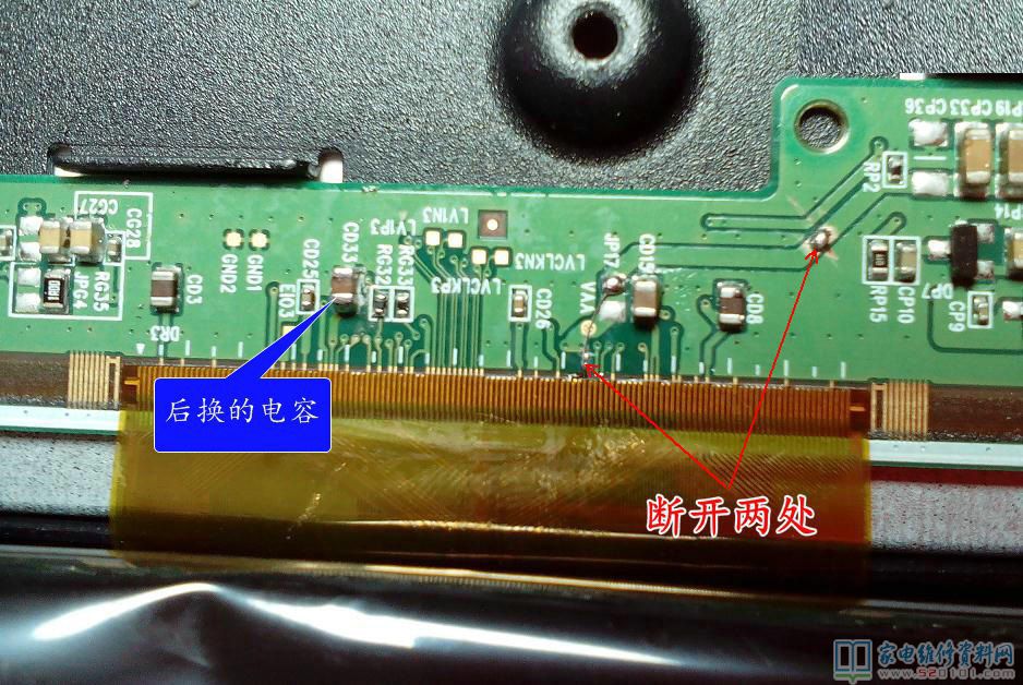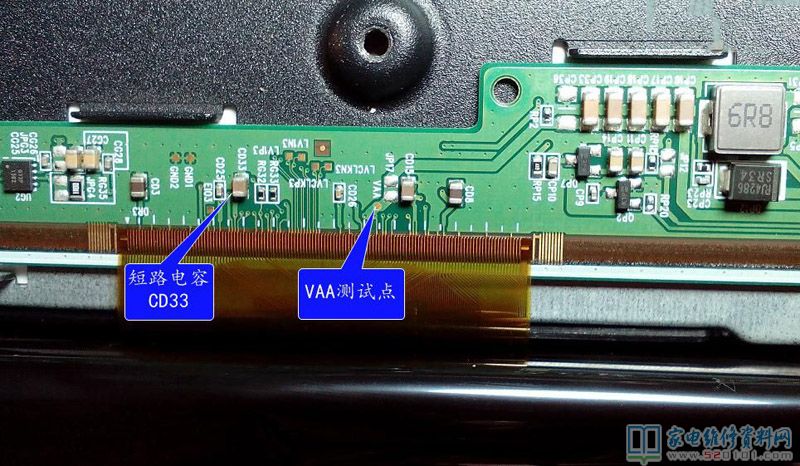 继续搜,又看到一篇文章,故障一样,最后他判断屏里短路了,最终放弃了。到这捷径是没了,还得自己想办法。于是准备用烧鸡大法找短路点,又转念一想,别屏里短路,再烧出点别的故障哪可就不好交代了,于是先用壁纸刀割断两处VAA端,表一量,还是短路,再一细看,凡是软排线(COF)都有一条通往屏里的VAA电压,用断路法找短路点看来还是行不通,看来不用绝招是不行了,于是请出自制的“烧鸡”电源调到3.3V加到VAA处,打开电源开关,电流表显示4A左右,再看线路板安然无恙,再把电源调到5V,打开电源开关,电流表指针瞬时打到头(20A表头),这时边板一缕青烟直上云天,终于看到一贴片电容冒烟了。赶紧用烙铁取下,一测果然短路了,旧版拆一个头差不多的电容换上,开机,开机画面终于出来了,再测VAA电压为17v。看来边板电容短路是该机的通病。