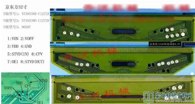 接修一台假冒夏普32寸,此机开机蓝屏,出现商标时为竖彩条,无信号时是左右游走的彩条。测屏一体逻辑板,VGH22伏,VGL-7伏,STV7伏,VDD3.3伏。屏幕右侧有两个耳朵,刮开测试点测量,VGH22伏正常,VGL-7伏为2.3伏,不正常。其他点基本正常。决定飞线试试。在网上找到京东方液晶屏飞线图,此机的屏是HTV320WX02-206.把一体逻辑板上的VGL-7伏用漆包线跳接到耳朵上的VGL上,两个耳朵相通的。试机果然成功了。没来得及拍照片就装上了。我把飞线图贴出来,大家参考。