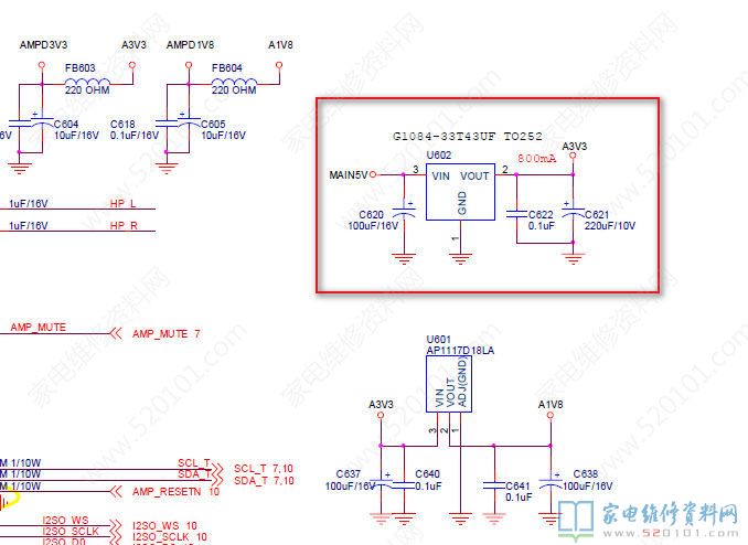 接修一台AOC冠捷L32BN83液晶电视,故障表现为无伴音,电视开机输入信号喇叭有很大的嗡嗡杂音 ,拆开机器,检查发现U602(5V转3.3V)的击穿导致5V电压直通STV8317F音频处理芯片损坏,U602(G1084-33T43UF)可以用1117(也是5V转3.3V模块)代换,更换STV8317F后,故障排除,试机一切正常。