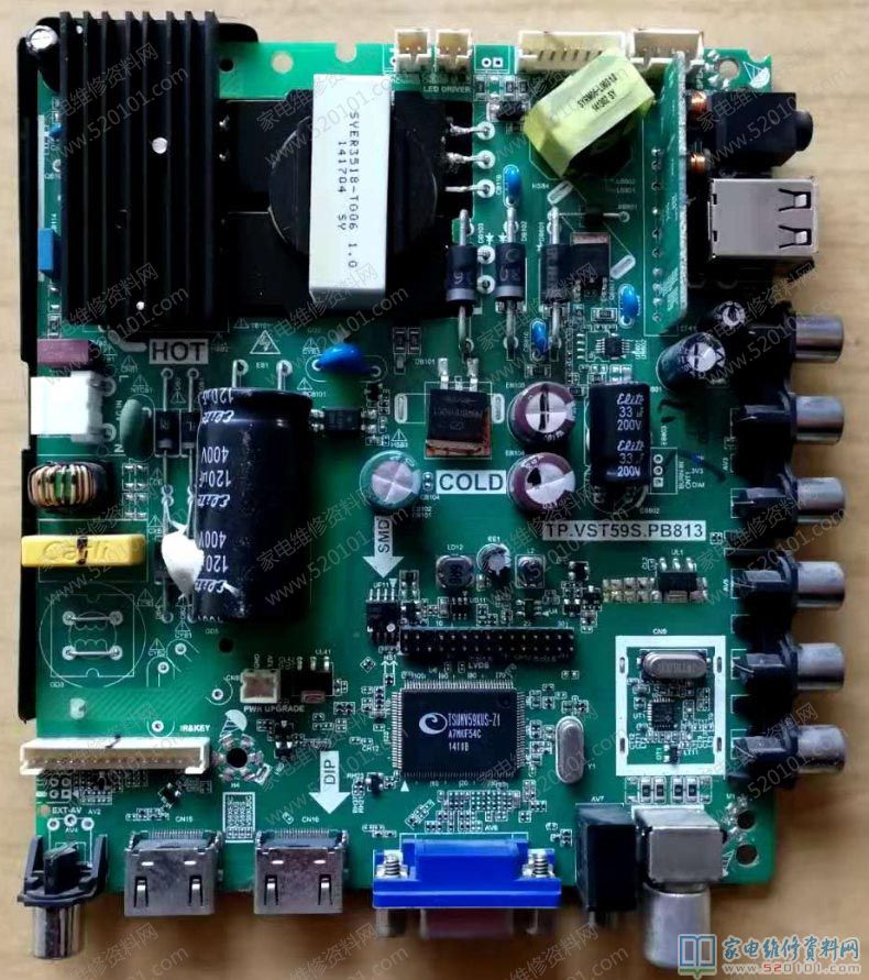 拆机发现是三合一板子,测量220V交流已经到达主板,看来不是开关的问题,简单测量12V正常,背光0V、3.3V正常、5V正常、1.2V正常、1.8V不正常是0V ,看来是这个DDR供电不正常。