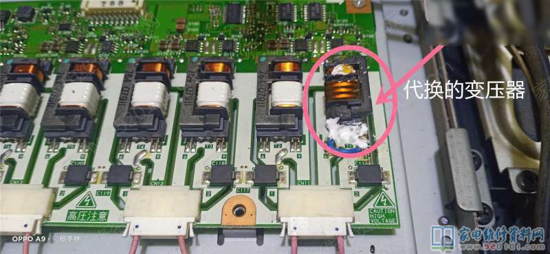 在线测试原机高压板上好的变压器,次级阻值在2K左右。拆下损坏的变压器,把初级的线圈拆下,算了一下有25圈左右。最后找到一块三洋电视机上的旧高压板,测量次级阻值正好在2K左右,把初级线圈全部拆下,重绕25匝左右。再重新装机,上电开机,久为的背光终于出现,上信号线,图声正常。