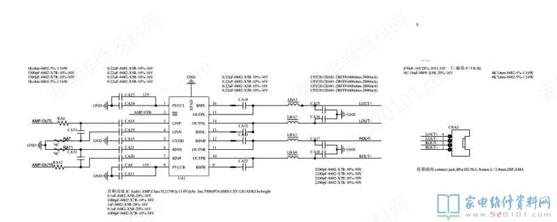 最近接修一台广州产的杂牌液晶电视,型号是CH50BP7310,故障表现为无伴音故障,图像正常。拆机检查伴音供电12V正常,伴音块型号为CSY1281AER,在网上查到了图纸,但没参数,不知道各脚电压值,遂采用信号干扰法,干扰信号输入端,无效果。