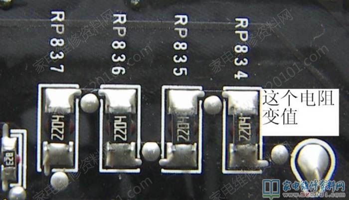 接修一台小米L40M2-AA液晶电视,故障表现为上电后按面板或遥控器是的电源键开机,背光亮,但在出现小米厂标后突然黑屏进入待机状态,反复开机均如此。根据故障现象分析,怀疑软件数据出错。在寻找升级软件过程中有网友说此故障系电源板上的PFC电路取样电阻漏电所致。上电开机,测得PFC电压只有300V,看来PFC电路确实没有工作。检查PFC电路取样电阻RP834~RP837(2.2MΩ×4),如图1所示,发现RP834阻值为1.6MΩ。清除这4只电阻下面的底胶,并更换RP834后试机,机器不再自动进入待机状态,但一直停留在开机画面上,无法进入开机桌面。接下来进行强制恢复出厂设置操作。