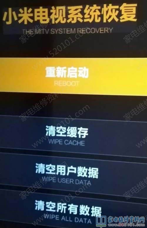 在图2中,有4个选项,其中“清空缓存”是清除启动过程中的部分临时数据,“清空用户数据”是清除用户设定的数据(如频道、图象、声音等),相关设置恢复为出厂设置。“清空所有数据”是清除上述数据外,还将清除用户下载的各种程序和APP。