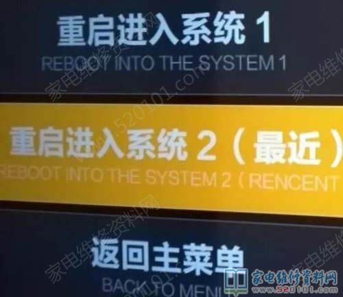 在电视机处于交流断电状态下,同时按住遥控器上的主页键和菜单键不放手,再接通电视机电源,这时会出现如图2所示画面,选择最上面的“重新启动”,按确认键后会出现如图3所示的画面,共有3个选项,其中“重启进入系统2(最近)”表明本机上次启动时是使用该系统,由于某种原因该系统无法启动。按遥控器向上键选择“重启进入系统1”,然后按“确认”键,此时机器会自动重启。重启后图像声音均正常,故障排除。这时再重复上述操作,发现最近启动的是“系统1”,但选择“系统2”也能顺利启动,这说明两个系统都已成功修复。