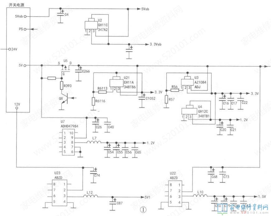 例1:一台联想50A21Y型液晶电视,上电后红灯亮,二次不开机0分析检修:上电,测得开关电源输出的5Vsb电压正常,但12V电压在9V72V之间波动,5V电压略有波动,24V电压在23V〜25V之间波动,ps电压在1V~3V之间波动。正常时,上电后ps电压持续两三秒高电平后消失,5V、12V、24V电压也会在两三秒后降为0V。为了准确判断故障部位,断开开关电源与主板的连接线,在开关电源的12V端子与地之间接一只12V灯泡作为假负载,然后用一只4.7kC电阻跨接在ps端与5Vsb端之间,上电后灯泡亮,测12V.5V.24V电压均正常稳定,说明开关电源正常,问题出在主板上。检查主板上的DC-DC转换电路,发现3.3Vsb电压仅为2.5V,但U2③脚输入电压为5V(正常),怀疑U2不良。换上型号为LD1117-33的三端稳压块后通电试机,故障排除。提示:主板上3.3Vsb待机形成电路异常,导致3.3Vsb电压不正常,从而引起二次不开机,同时开关电源输出电压波动.