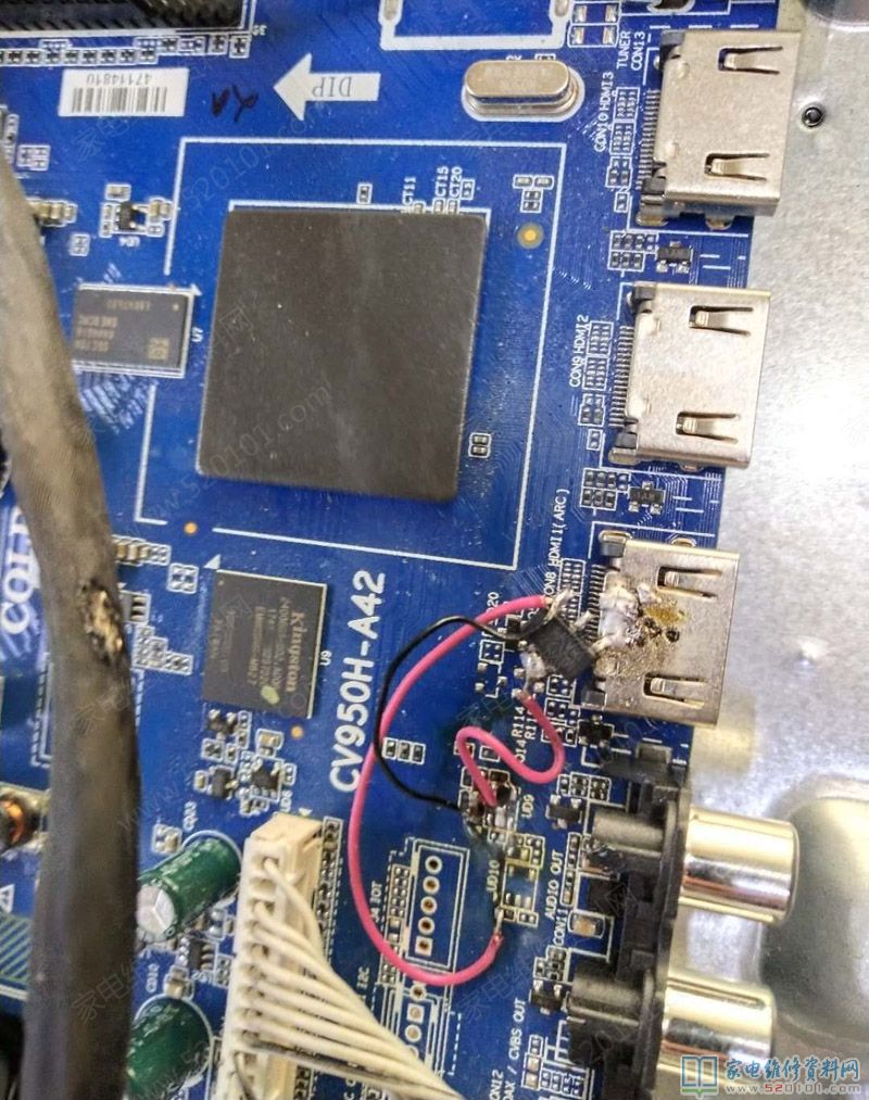 接修一台先科43英寸网络液晶电视,故障表现为通电后死机,拆机检测主板进水,部分氧化,主板型号为CV950H-A42,测12v、40v有,3.3v没有,其余的小电压都没有,在路测3.3v对地短路。