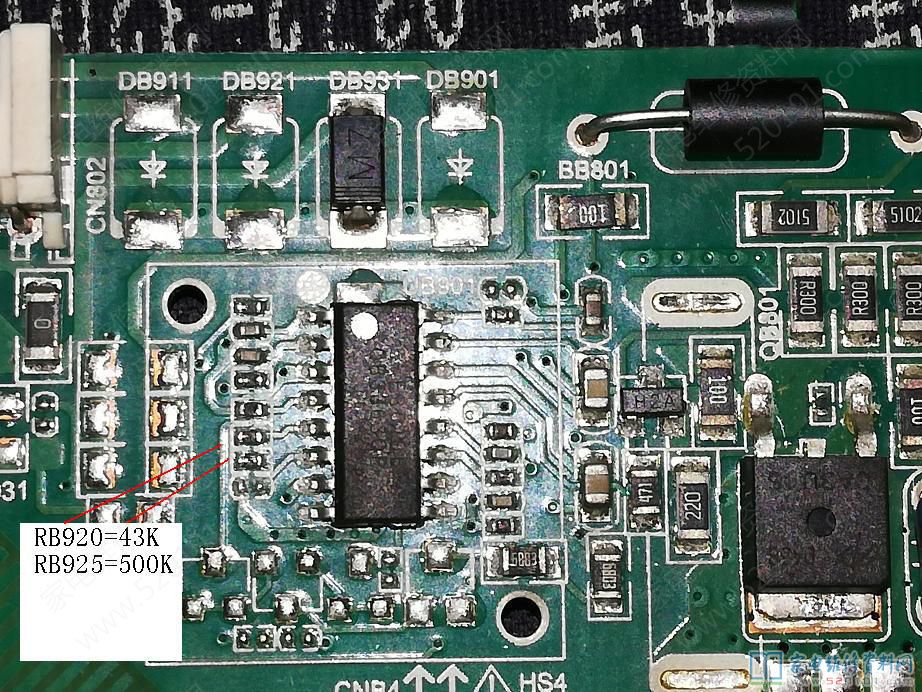 参考网上资料,OB3363电流设置5脚,RB920=43K,RB925=500K,并联电阻为39.5K,实测40K。改电流去掉RB920,找到一个56K贴片换上,太小不好焊,采取飞线,发泡胶固定。改后上机实测,电压110V,电流167MA,达到要求。试机半小时,摸后壳温,无太高温升,装盖交付使用。