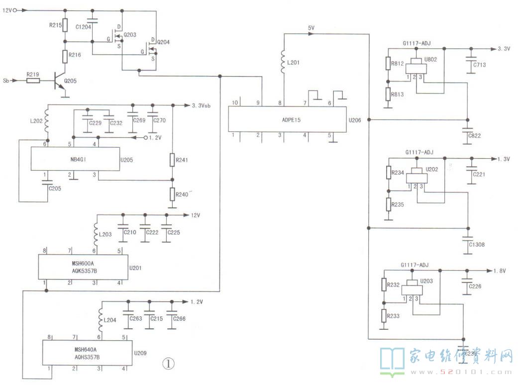 经U206内部续流二极管整流,C822、C1308、C236滤波,产生5V直流电压,分别加到三端稳压器U802.U202和U203的③脚,稳压后输出3.3V和1.8V电压。