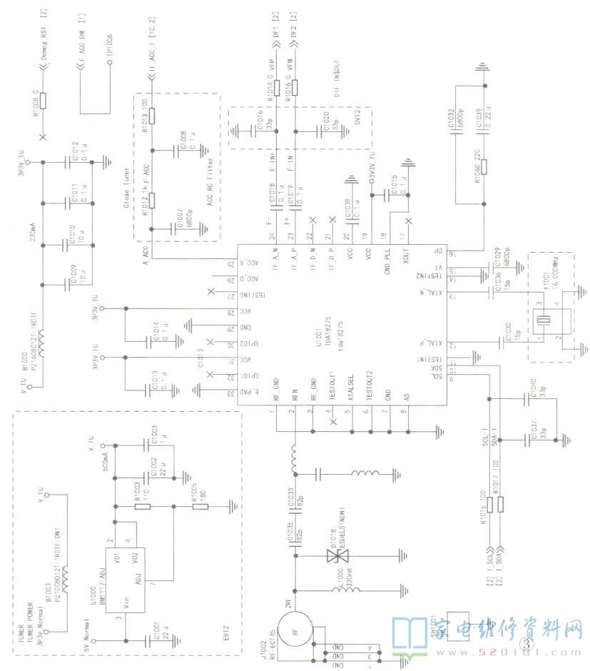 检查系统电源是否正常,B1000、U1000输出电压是否为3.3V;检查高频头晶振Y1001是否起振;检查高频头部分rC信号T_SCL、T_SDA是否正常(关键测试点R1015.R1017),不正常则检查U1001是否焊接有问题;检查高频头中频信号电路元件:R1014、R1016、C1016、C1020、C1018、C1019焊接是否正常。如以上检查均正常,则更换高频头即可,相关电路如图3所示。