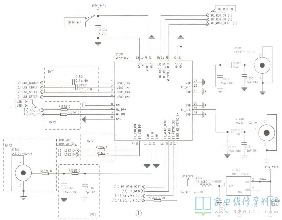 首先检查天线同轴线与主板连接是否安装到位;再检查模块的供电3P3V_ WIFI(3.3V )是否正常;检查模块的控制信号BT. REG. ON是不是高电平,如不是,更换U1301;检查USB2. D-/USB2_ D+信号是否正常( 关键检测元件R1326、R1327),如USB信号不正常,更换U1301。相关电路如图1所示。