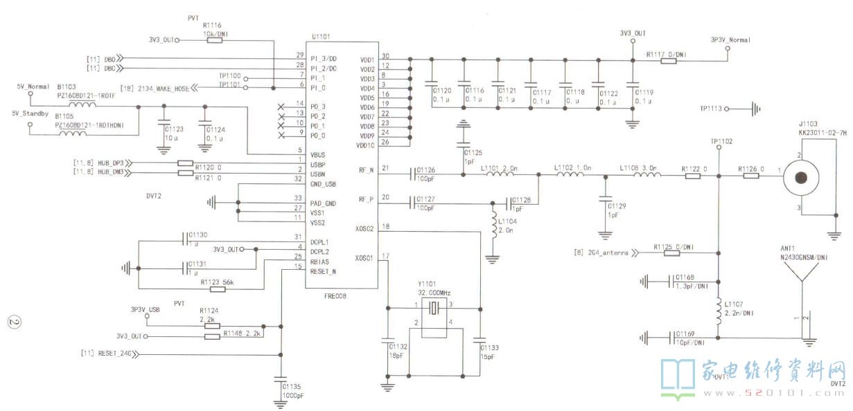 首先检查天线连接是否正常:同轴线安装是否到位;RF通路元件有无虚焊或损坏。然后检查U1101 (2.4GHz 处理模块)是否正常工作;Y1101( 32MHz )输出是否正常。再检查U1101供电:5V_ Normal及3V3_OUT输出是否正常;HUB_ DP3.HUB_ DM3信号是否正常(关键元件R1120.R1121),如USB信号不正常,则更换U1101。相关电路如图2所示。