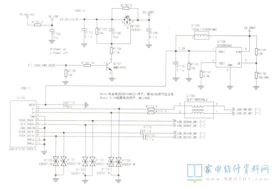 测量USB供电5V是否正常(检测点为J1100的①脚),如不正常,测量其输入电压5V_ USB3是否正常。若5V_ USB3正常,则检查5V的转换块U1106是否损坏;若不正常,则测量5V_ DEVICE是否正常(见USB HUB U1103维修)。若5V_ Device正常,则测量USB3_ PWR_ EN 开机后是否为高电平,是否有对地短路现象,若是则需检查R1102.CPU是否有虚焊。