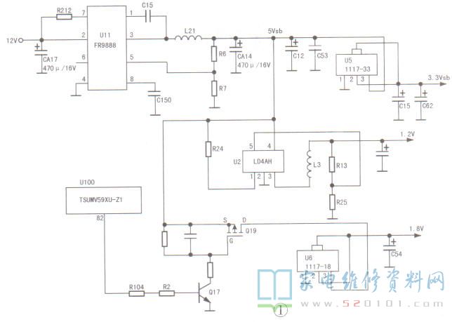 本文以高路华YL2688型LED液晶电视采用三合一主板为例,其板号为VST.P594-V2.1(属于V59通用主板)。该主板上的DC-DC转换电路如图1所示。5Vsb待机电压形成由U11(FR9888 )及其外围元件完成。