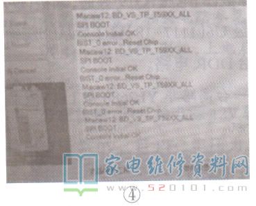 检修实例1:一台高路华YL2688型LED液晶电视,红灯亮不开机。分析检修:上电,测量开关电源输出的12V电压及DC-DC电路输出的5Vsb.3.3Vsb.1.2V电压均正常。连接上编程器与电脑,上电查看开机打印信息,显示如图4所示,第4行出现"BIST-0error字符,说明系统对DDR检测失败。