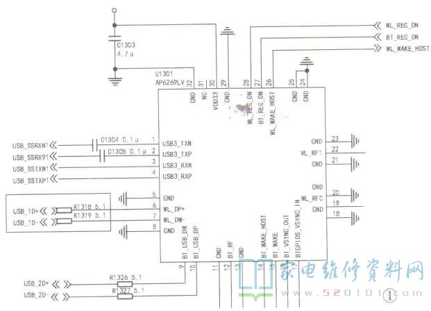 分析检修:此故障原因主要有三个:一是无线WIFI密石或网络设置异常,参照用户手册重新设置即可;二是软件导常,可换上已烧好程序的Flas存储器,或通过U盘重新升线软件;三是WIFI模块U130 ( AP6269LV )或天线不良,此时先检查同轴天线与主板的连是否正常,再测量该模块的3P3V WIF(3.3V)供电(测试点为U1303的30脚或电容C1303的非接地端)及控制信号WL, REGON(测试点为U1301@脚,正常时为高电平)是否正常,接着检查电阻R1318.R1319处的USB_ 1D+、USB_ 1D-信号是否正常,最后更换模块U1301,故障排除。相关电路如图1所示。