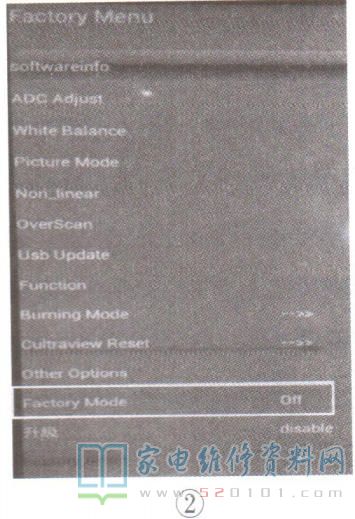 分析检修:开机后屏幕出现雪花点,开机桌面设置无效,这通常是工厂老化模式没有完全退上引起的。处理方式是,按遥控器上的“信号源'键后速按数字键"2、5、8、0"进入维修模式;再将工厂模式("Fac-tory Mode")ON”设置成“OFF" ,然后遥控关机即可。如图2所示。