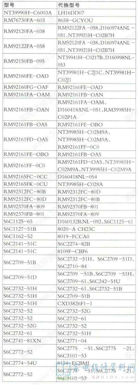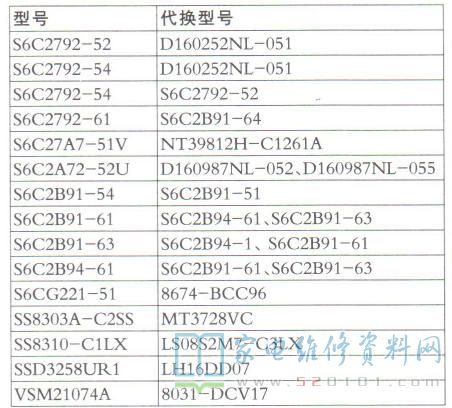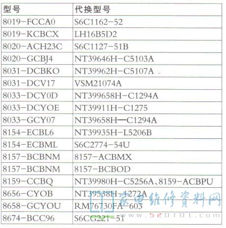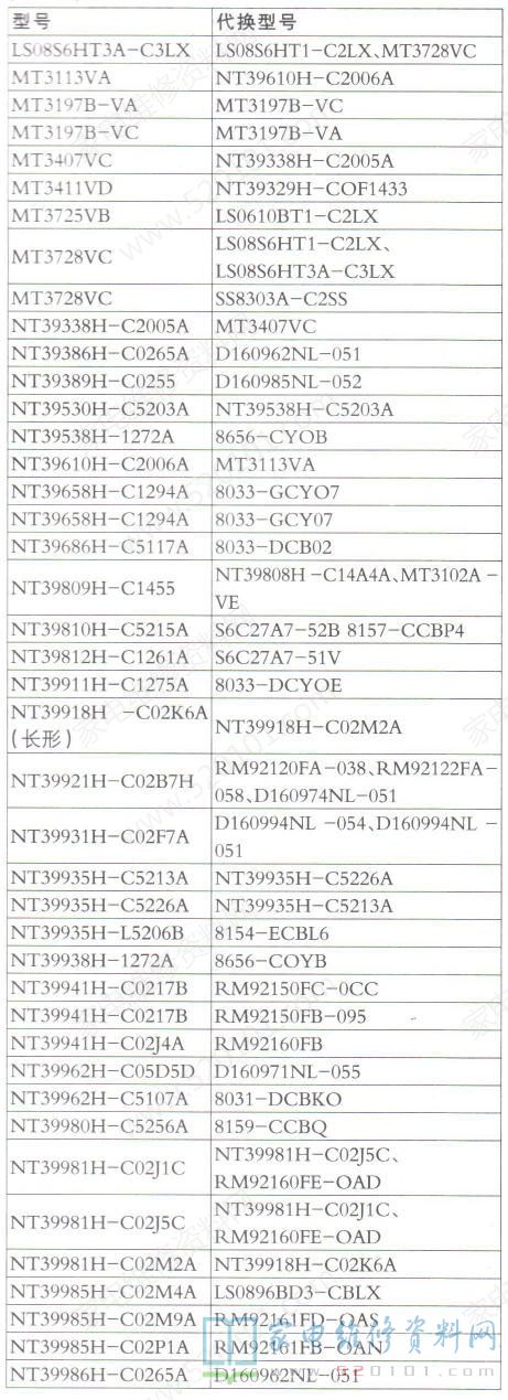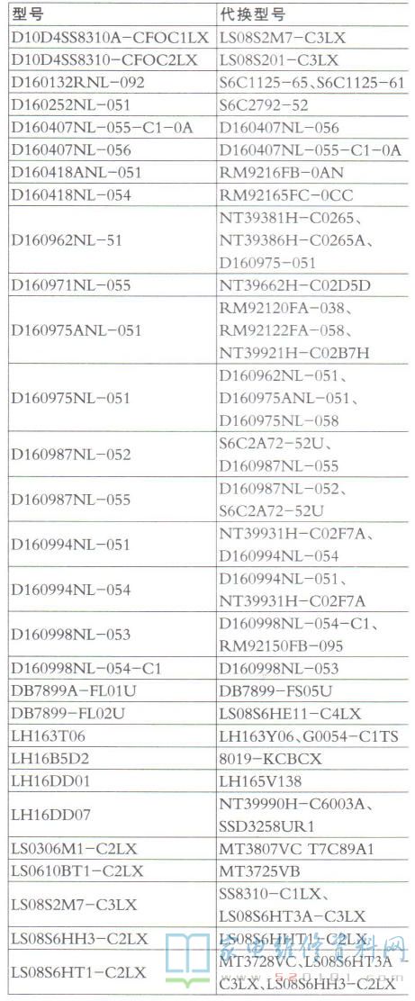 TAB是英文Tabulator的缩写,表示将芯片预先封入编带内的焊接方式,又称带载自动焊,是一种新型微电子互连技术,能有效地减小引线间距,从而实现有限空间内的多引线连接。现有液晶屏的TAB模块引线间距已降至0.15mm,TAB引线可达864条。液晶屏中的TAB模块是指采用TAB方式将液晶驱动芯片进行薄膜化封装的一块小电路板,如图1所示,各型号对应的代换型号如表1所示。TAB模块通过热压方式与液晶屏玻璃体的引线端相连,以驱动液晶屏。