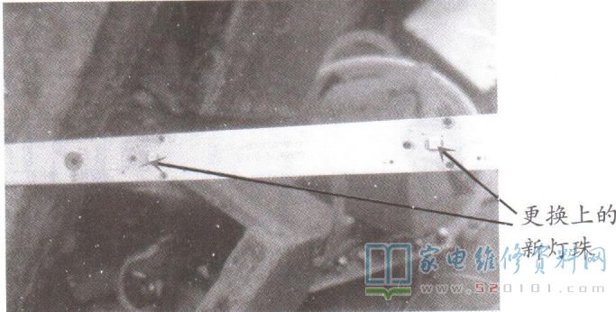 小心地拆开液晶屏,找出压降异常的灯条,用万用表的二极管挡测量该灯条上灯珠,发现6颗灯珠损坏。先取下6颗灯珠上的散光镜,再用热风枪吹下损坏的灯珠,然后换上同耐压、同规格的3V灯珠,如图1所示,最后用502胶粘固好散光镜。把修好的灯条给装回机内并连接好供电线,上电开机,灯条发光正常。断电,装好屏幕后上电试机,故障排除。