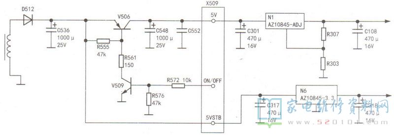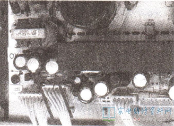 将上述电容及主板上的3.3V电压滤波电容C318、C108一并换新,再次通电,给电视输入模拟AV音视频信号,图像完全正常,故障排除。相关电路如图3所示。