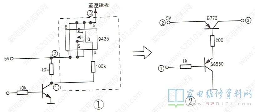 一台杂牌26英寸液晶电视,有时正常,有时图像闪烁或白屏。分析检修:测逻辑板5V供电在图像闪烁或白屏时,该电压在2.6V~3V之间波动。该机给逻辑板供电电路如图1所示。故障时测得场效应管9435的源极电压为5V,栅极电压为2.8V,而漏极电压在2.6V~3V之间波动,看来场效应管性能劣化。由于手头没有场效应管,于是用一只三极管S8550和一只大功率三极管B772组成图2所示电路,代替图1虚线框中电路。B772 用绝缘垫隔离,再用螺丝固定在机器铁壳上散热。上电试机,测得逻辑板供电为稳定的4.9V ,故障排除。