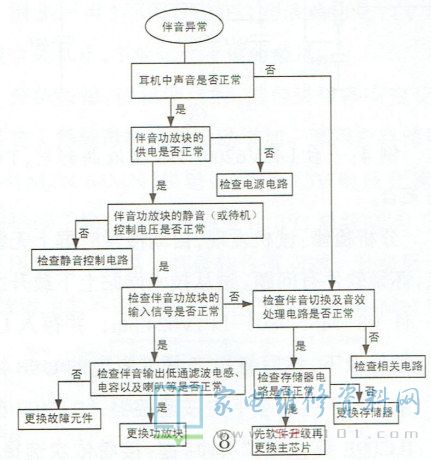 步骤七:先检查存储器电路,再进行软件升先检查存储器的供电、总线电压是否正常,与主芯片的通信是否畅通,然后进行软件升级,最后代换主芯片。提示:若伴音中有杂音,并同时佯有黑屏、死机或自动关机等现象时,需检查主板各组供电是否正常,主芯片与各存储器之间的通信是否正常,主板是否受到屏体或外界的强干扰。综上所述,伴音异常故障的检修流程如图8所示。