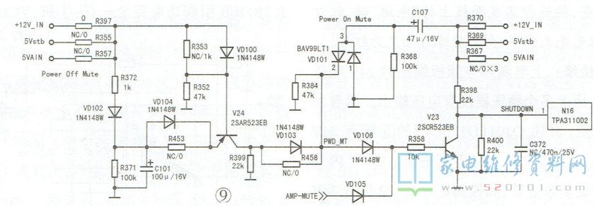 该机静音电路如图9所示。测得VD106正极电压在1.1V~2V间波动,但VD101及VD103的正极电压均很低,即VD101、VD103均处于截止状态,这说明主板有漏电现象,估计是VD106旁边的过孔漏电。拆下VD106,并断开其焊盘铜箔,用导线将其正、负极分别与VD103负极和VD105正极相连后试机,故障排除。