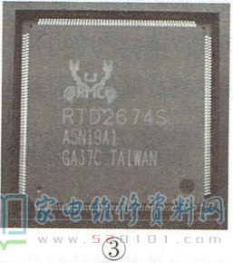 许多液晶彩电的主芯片内部除集成有音频解码、放大电路外,还集成有音频DSP或音频DAC电路。音频DSP(Digtal Signal Procssig)是指采用数字技术对音频信号进行处理,以产生诸如分频、均衡、混响、延时等音效。音频DAC(Digial Analog Converter )电路又称音频D/A转换器或数模转换,其作用是将离散的数字量转换为连续变化的模拟量。若上述电路性能不良或损坏,就会出现伴音中有噪音或无声故障,如主芯片采用RTD2674S的海尔、创维等型液晶彩电中,易出现开机几分钟后伴音变小且出现杂音这一通病,究其原因,RTD2674S内部音频DAC电路热稳定不好,应急解决方法是将RTD2674S 215脚外接的3.3V供电电感换成一只10Ω电阻,以降低其内部音频DAC电路的发热量。RTD2674S的外形如图3所示。