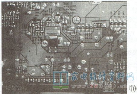 分析检修:在故障出现时,测得导线J854-端对地电压在3V~8V之间波动,同时喇叭中有噪声。当该点电压超过9V时板上测试点HS4的电压从正常的13.6V降为0V,电视出现无伴音、黑屏、绿灯亮故障。经查导线J854至DB851之间的铜箔开路,原因是板上这段线路的铜箔过细,如图10所示,使用一段时间后腐蚀开路。