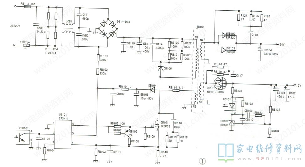 通电后,220V交流电一路经二极管DB1~DB4桥式整流后,在滤波电容EB1上产生约300V直流电压:另一路经DB1~DB4中的一只二极管半波整流后,通过启动电阻RB101 RB102送到UB101(273H11)的⑤脚,电源启动。开关变压器TB101的初级绕组N2两端产生的感应电压经RB114限流、DB104整流后,在滤波电容EB106上产生约14V直流电压,取代启动电压。次级绕组N3两端产生的感应电压经二极管DB101整流后,在电容EB102.EB101两端产生12V直流电压,供给主板电路;绕组N4两端产生的感应电压经DB102、DB103整流后,在电容EB104两端产生24V直流电压,供给背光电路。
