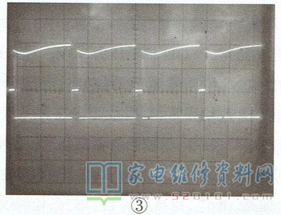通电后,12V电压通过电阻RB816 加在UB802的①脚,同时24V电压通过储能电感LB801加到场效应管QB801的漏极。二次开机后,主芯片TSUMV59XU-Z1的⑨脚输出2.5V的PWM-DIM电压,使得UB802的①脚DIM端电压为2.5V;主芯片的⑧脚输出1.5V的PWM-REF电压,使UB802的⑤脚电压为1.5V,UB802: 启动工作。UB802的②脚输出驱动脉冲信号,使QB801工作在开关状态,在储能电感LB801右端产生了幅度约62Vpp的脉冲电压,其波形如图3所示。
