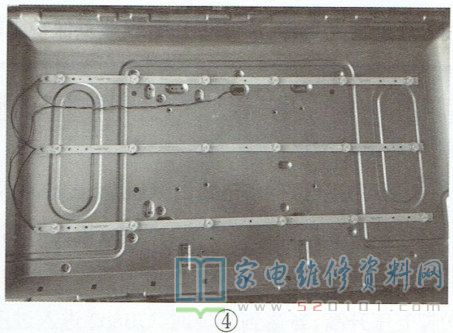 该脉冲电压经续流二极管DB801后产生35.5V直流电压,与输入的24V电压叠加,得到约60V的LED+电压,送给屏内灯条。该机屏内有三根灯条串联,每根灯条由6只灯珠串联而成,如图4所示。