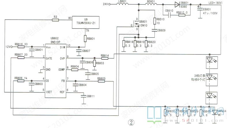 过压保护电路:该电路由RB814、RB803及UB802的⑨脚内部电路组成。LED+电压升高,则RB814与RB803的分压升高,即UB802的⑨脚电压升高,当达到阈值时,UB802进入过压保护状态,切断②脚脉冲输出,QB801截止,LED+电压降为24V。